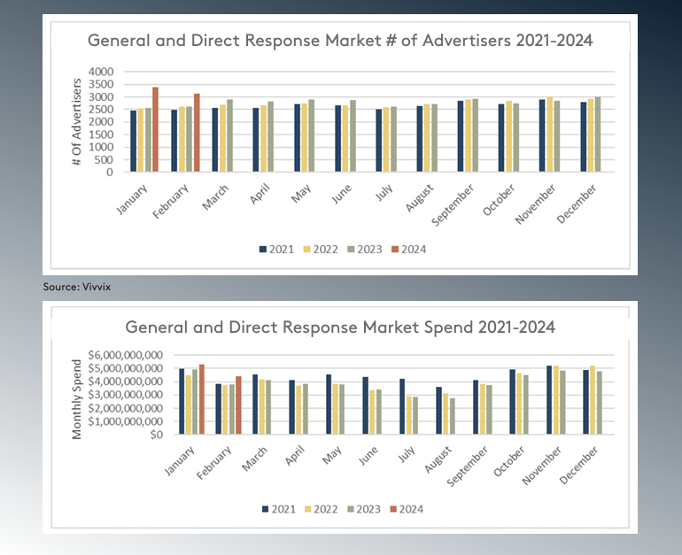 - According to Vivvix, the number of advertisers entering the marketplace in 2024 was up 31% compared to 2023, resulting in a 7% increase in total advertising spend in January. Preliminary February numbers show that trend continuing as the number of advertisers is 19% higher YOY and marketplace spend increased 17% higher YOY.